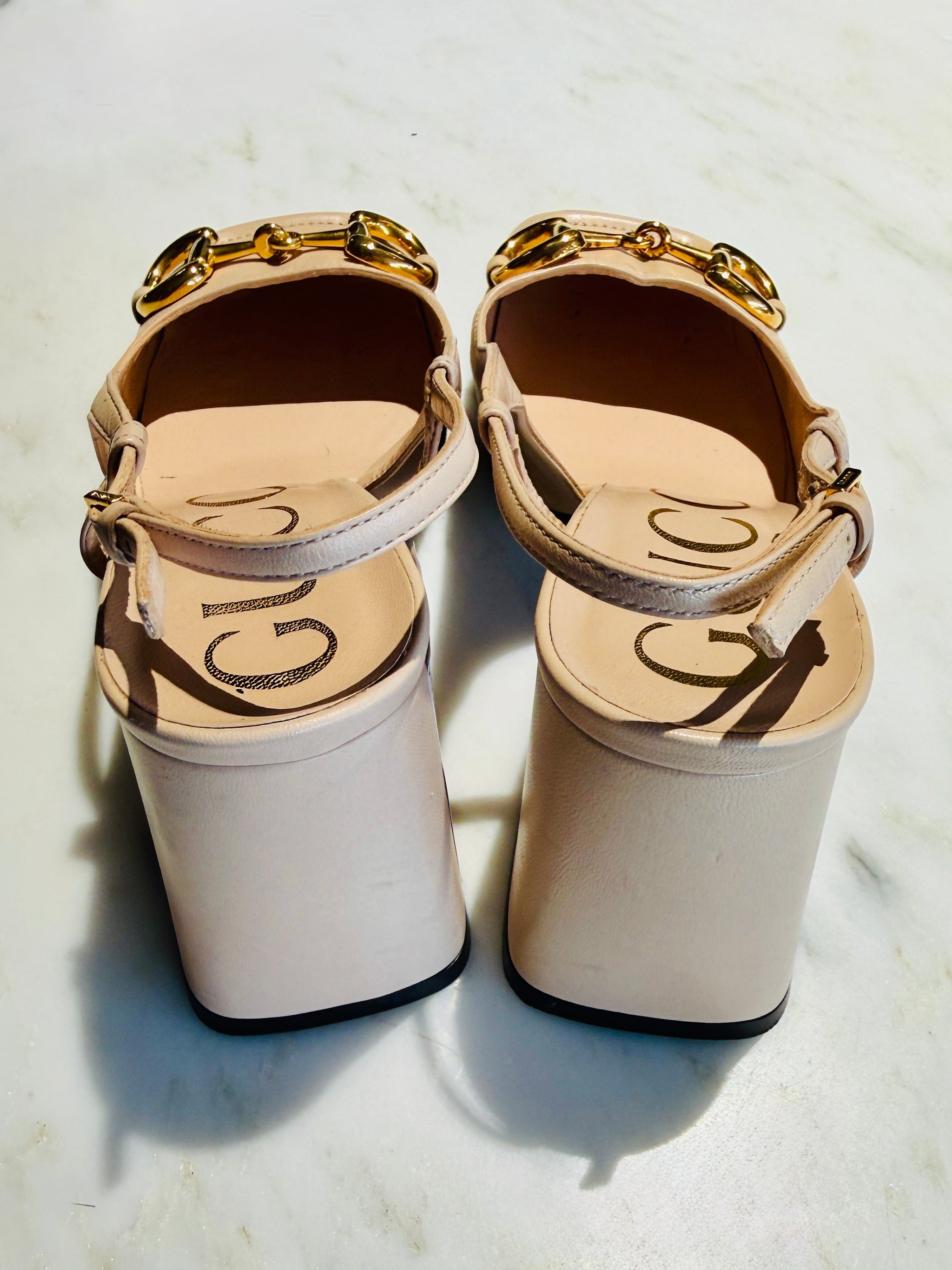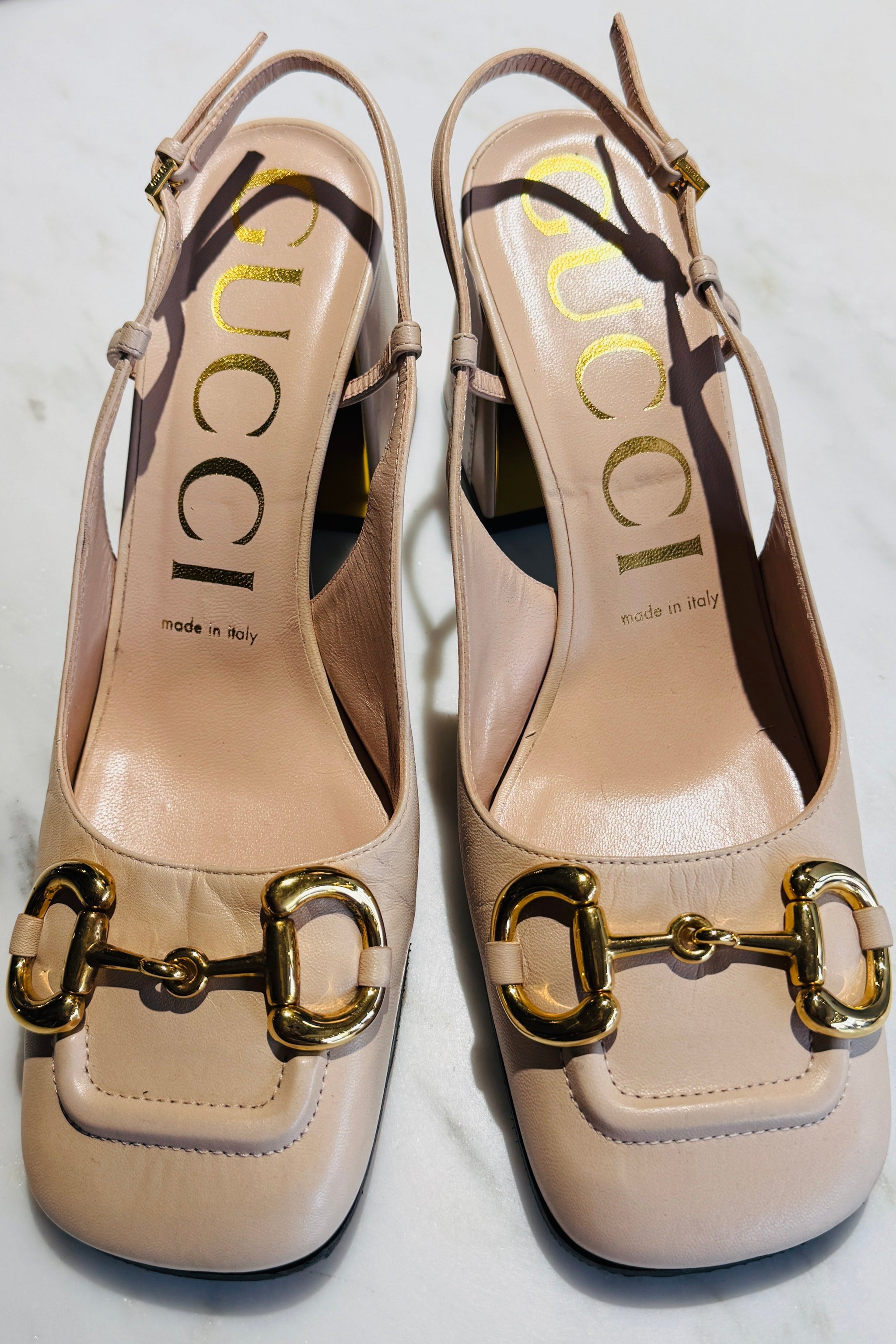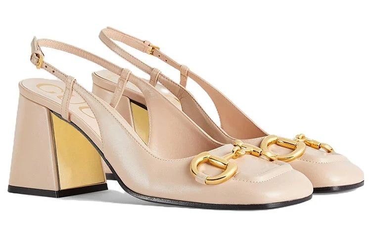 A slingback pump with vintage accents such as a square shaped toe and sculpted block heel. A code from the archives, the Horsebit detail connects the style to the House's equestrian roots. The style is presented in light beige leather and gold hardware.