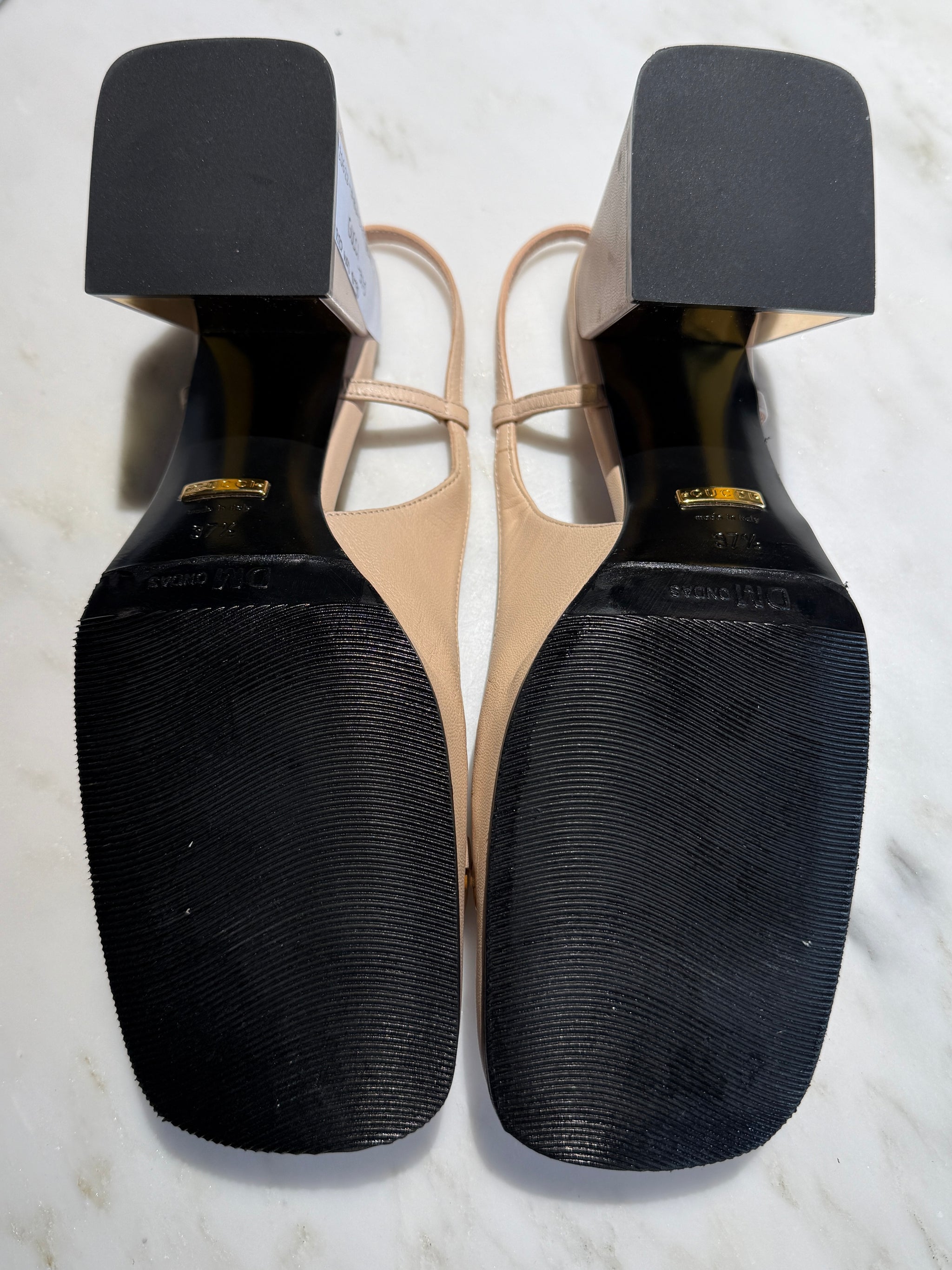 These pumps have been resoled and there are some minor scuffs on the heel. See photos.