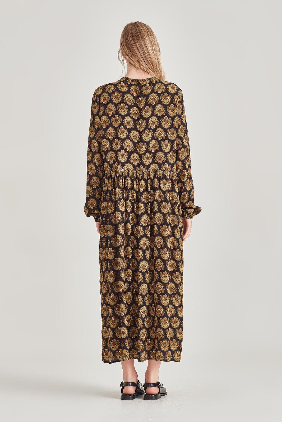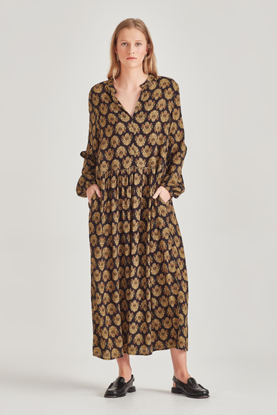 The new Kelsy is super easy dress to enjoy. Featuring a small stand collar, soft gathered skirt and full sleeve. She is not demanding and will layer up easily with your Winter knits.