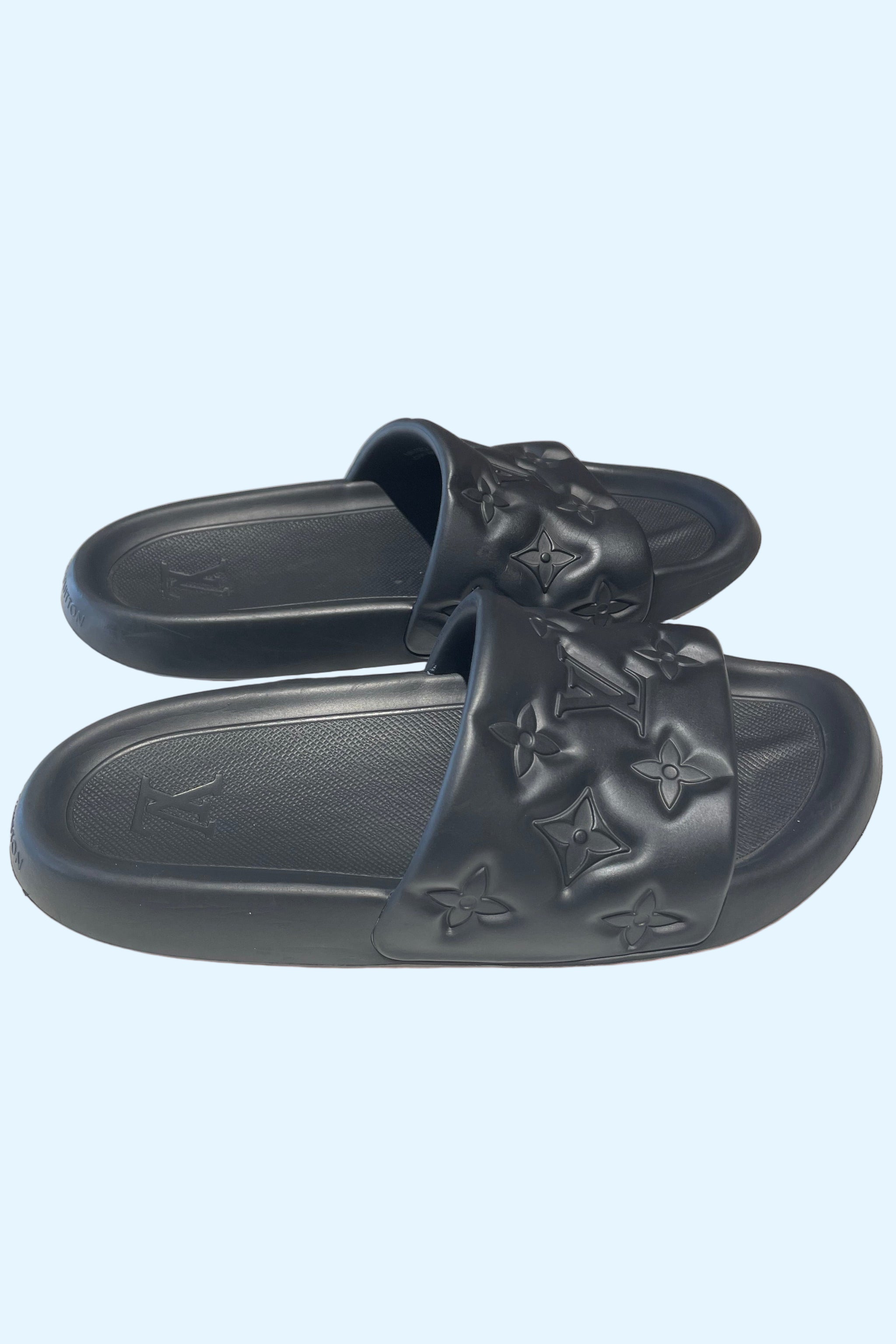 The Waterfront mule features a front strap embossed with Louis Vuitton's iconic Monogram pattern. This pool slide, made of waterproof rubber, also features an anatomic insole for comfort. The lightweight, flexible outsole is debased with the Louis Vuitton signature. No box or shoe bag included.