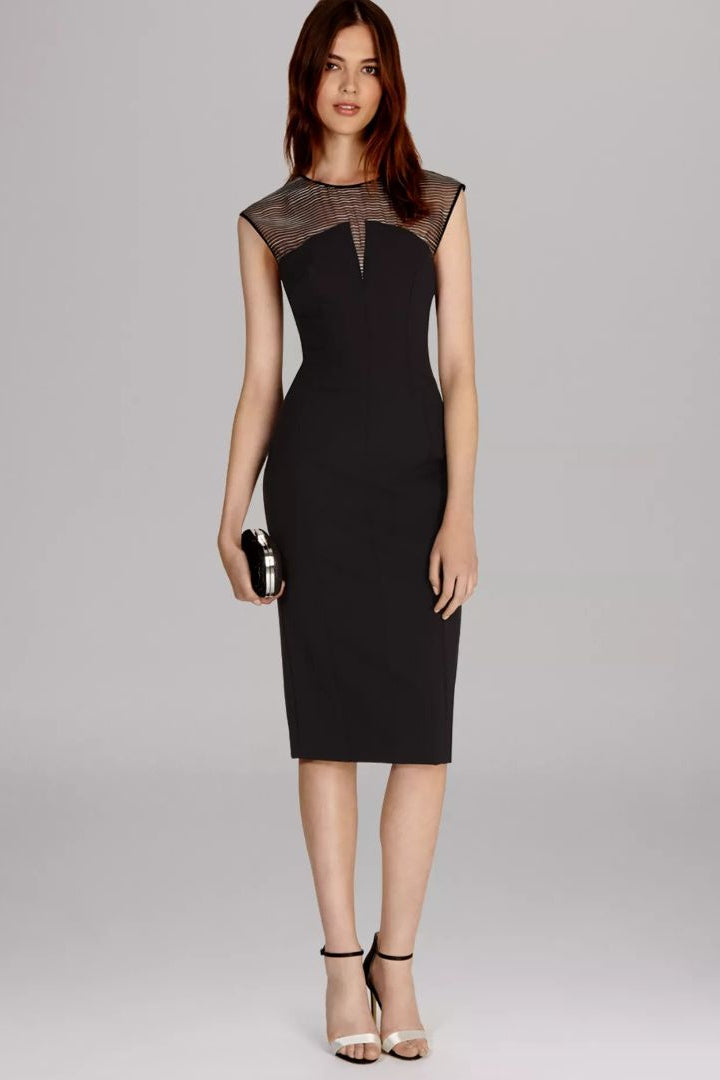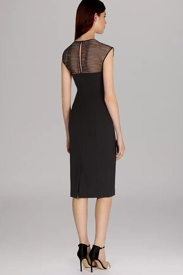 This silk panelled midi dress breaks up the LBD's traditional nature with a faintly striped illusion décolletage. Silk panel detailing creates a faint striped illusion, adding subtle texture and interest. It also features a keyhole back with button closure, a concealed back zipper, and a vent pleat for ease of movement.