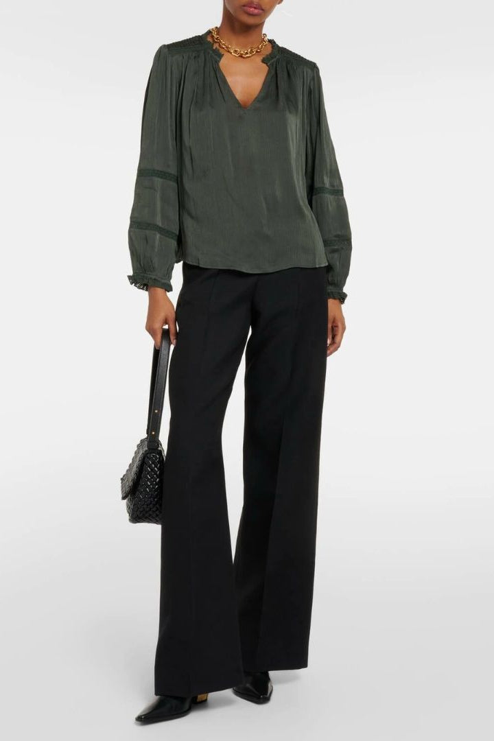 This blouse features a flattering V-neckline, with delicate lace insets along the sleeves and intricate lace detailing at the neckline and cuffs. Timeless and elegant, it’s perfect for elevating your look, whether for casual days or more refined occasions.