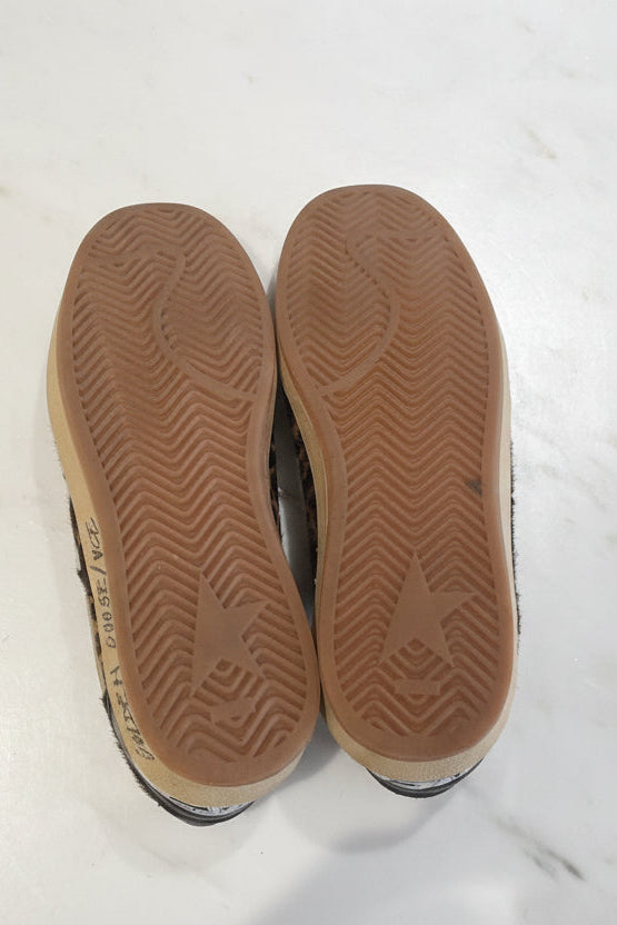Step into the perfect blend of 80s nostalgia and modern luxury with these 'Golden Goose' sneakers. Handcrafted in Italy with the brand’s signature “lived-in” finish, they feature a black nappa leather upper highlighted by a bold leopard-print pony hair star. Effortlessly cool and instantly recognisable, they pair just as easily with relaxed denim as they do with a structured midi skirt.