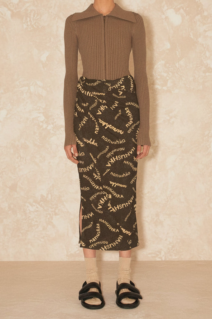 Designed with straightforward dressing in mind, the Taina skirt is cut to a bodycon mid-length to bring instant refinement to any outfit. Showcasing our hand drawn logotype print on sustainable mesh jersey, the skirt incorporates wrap elements which slice through the silhouette and drape effortlessly at the waist for a flattering finish.