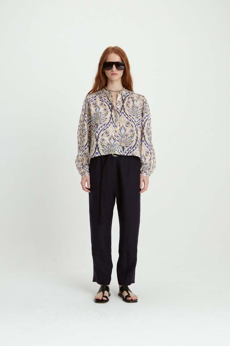 Delicate baggy blouse with long puffed sleeves and buttons in front, composed of cotton and silk voile. The print on this piece effortlessly captures the essence of a blooming floral dreamscape, delicately unfurling against a serene sandy backdrop. C