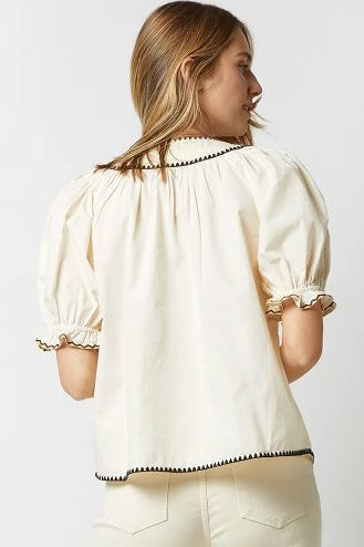 Ulla Johnson makes feminine, bohemian pieces that are heavy on handcraft and special details. The Ruby blouse is made up in UJ’s signature water-washed-poplin with puffed elasticated sleeves with ruffle trim, and a keyhole with a tie closure at the collar. It’s finished with very pretty, intricate contrast embroidery throughout.