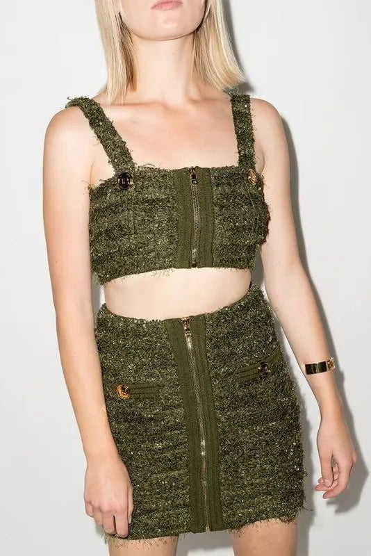 Khaki logo-buttons tweed crop top from Balmain featuring tweed, gold-tone hardware, logo-embossed buttons, front zip fastening, wide shoulder straps, sleeveless and cropped.