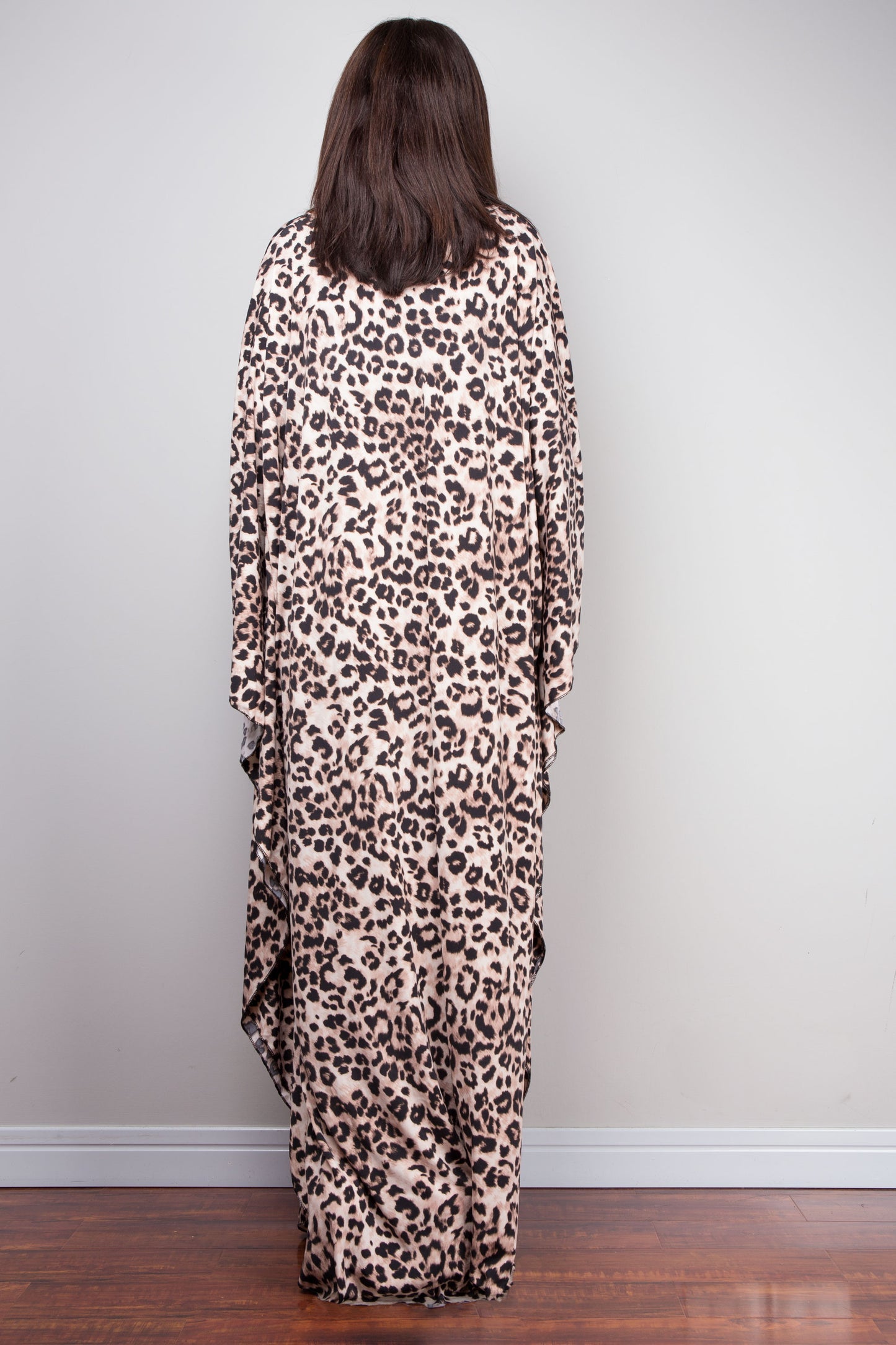 A handcrafted leopard print lends this caftan a bold, artistic edge, creating a standout bohemian piece. Its relaxed, one-size-fits-most silhouette ensures effortless comfort, and wide dolman sleeves add graceful movement, making it endlessly versatile for both laid-back and elevated occasions.