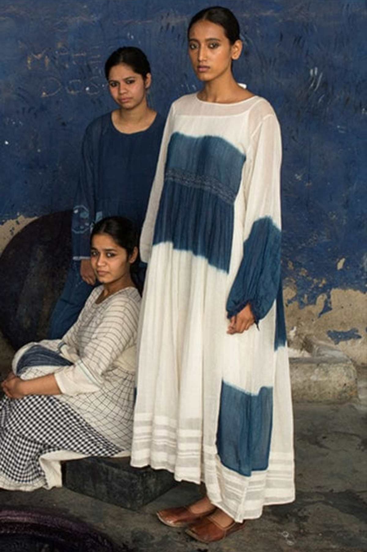 The method used to create the indigo pattern in this dress is called Clamp dying with natural indigo. Please make sure to hand wash it gently and be very careful while drying. Ideally lots of natural air/sun shine helps to ensure quick drying and will minimize the changes of the indigo bleeding. Alternately dry cleaning is the safest option.