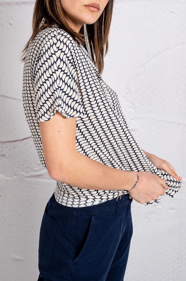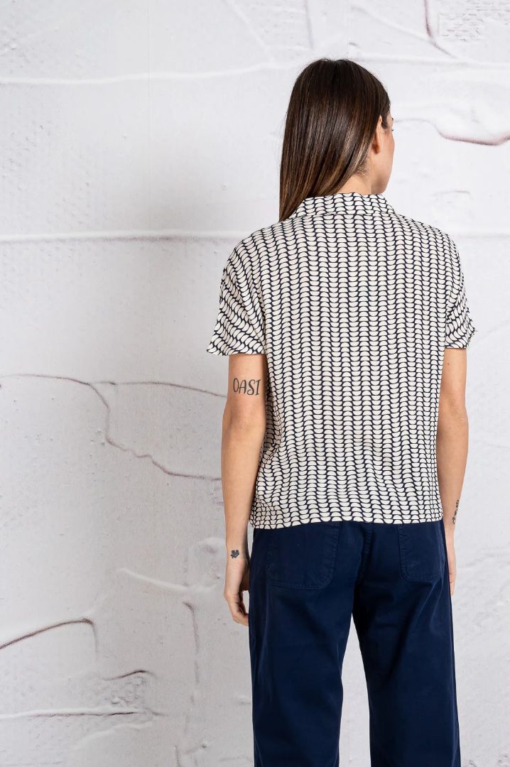 Shirt in sustainable viscose fabric with optical micro print . Detail of lapel collar ,front navy buttoning and scallop sleeve.