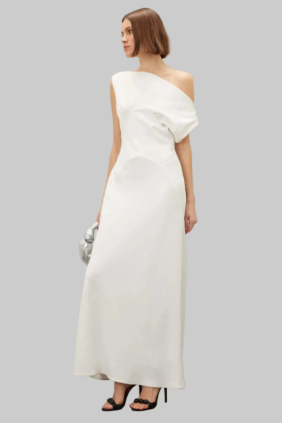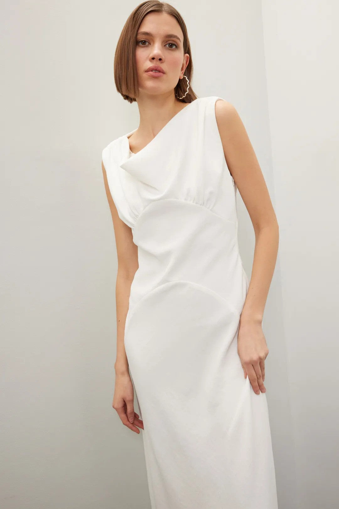 Paris Georgia Raina Dress in off White is a fluid dress featuring a curved bust seam and bust gathering. The Raina dress can be worn to suit your feel , an off the shoulder sexy look or a more demure cow neck. Fabric has a woven texture finish of a medium weight styled in a loose fit that floats off the body.