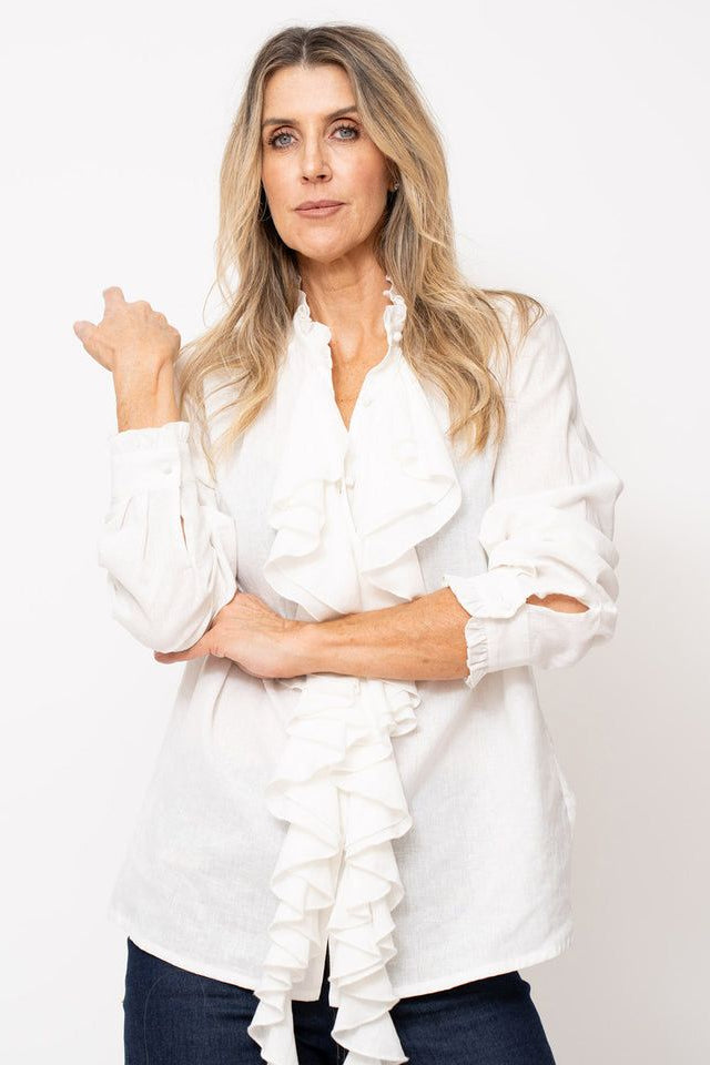Indulge in sophistication with our Santiago Shirt. The ruffle front, adorned with covered buttons, exudes elegance. The cotton lawn fabric adds a touch of luxury. Make a statement with this exclusive piece, inspired by the world of art, literature, and fashion.
