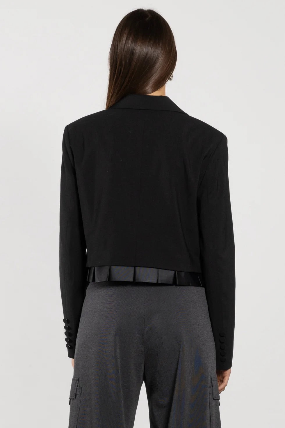 It's cropped length and pleated contrast fabric peeking from under the hem bring a fresh twist to a timeless silhouette. Fully lined with a round hem and button details along the sleeves, it exudes polish and charm. Front pocket flaps and a button closure add functionality.