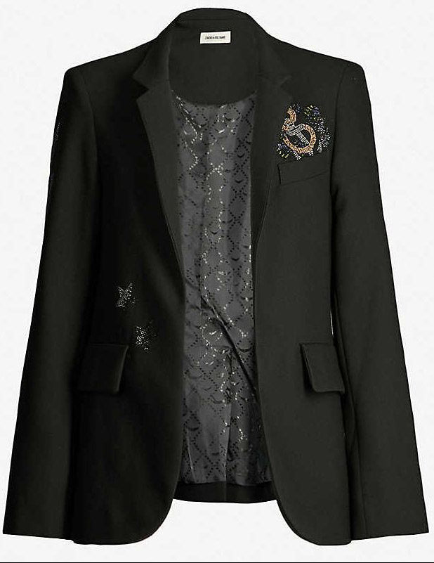 The Zadig & Voltaire Very Multi Custo Jacket is an embellished long-line blazer with a signature rock-chic edge. Featuring a sharp upturned collar, one-button fastening, and a tailored silhouette, it’s elevated by rhinestone detailing along with front pocket and sleeve embellishments.