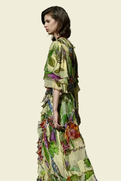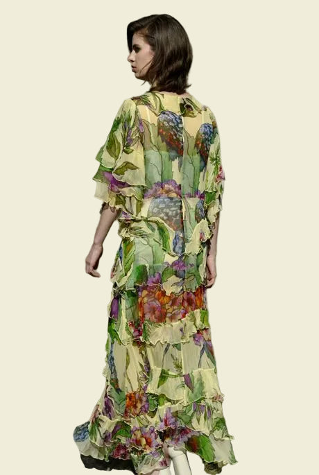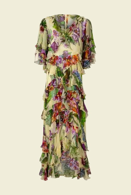 Your solution to event dressing is the ‘Good Day Sunshine’ dress. Crafted in the whimsical ‘Bloom to Move’ viscose yoryu, this dress features layers of baby-locked flounces creating soft, effervescent movement. Offering soft layers through the sleeve, this dress is the ultimate choice for in between season dressing.