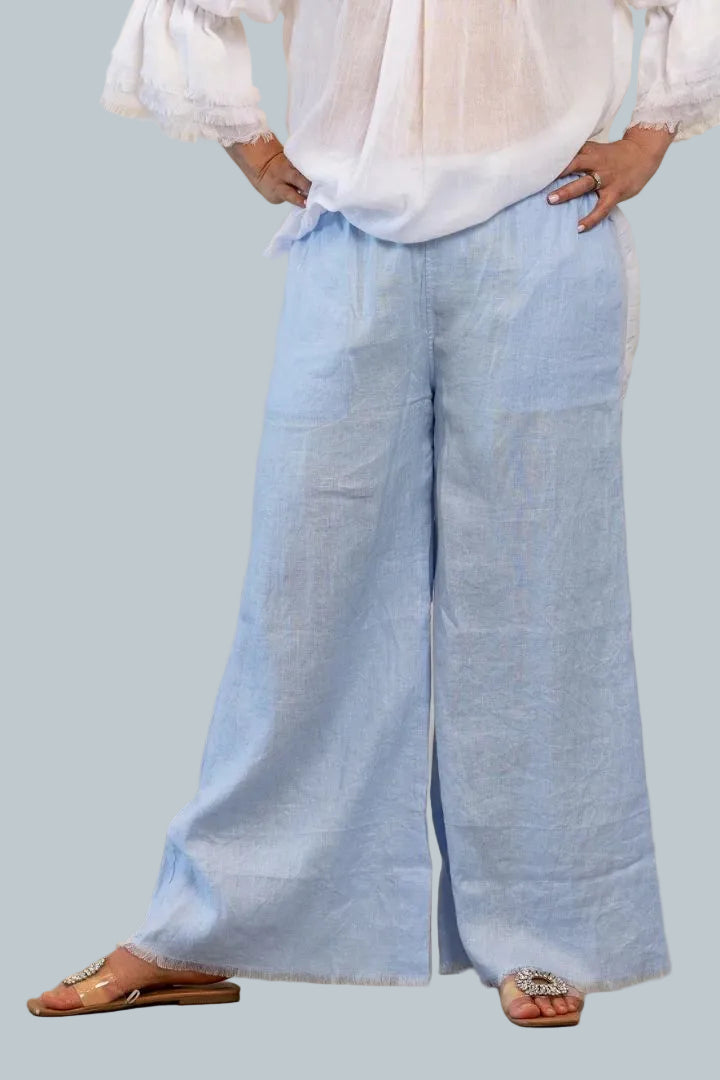 These versatile pants will blend seamlessly with your current wardrobe. Perfectly slouchy, they feature side pockets, a deep elastic waist band and, wide leg frayed hem with a side opening vent. Note they are a generous fit, can easily size down.