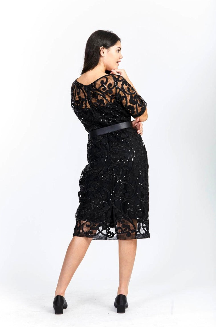The Trelise Cooper "Royal Hour" Cocktail Dress is beautifully adorned with paisley swirls of embroidery, edged in shimmering sequins, on a delicate fine-mesh nylon base. Designed to be worn over a bodysuit or paired with a Boudoir slip, it’s a statement piece that celebrates confidence and individuality. "Self-confidence is the best outfit—rock it and own it". Please note: slip not included.