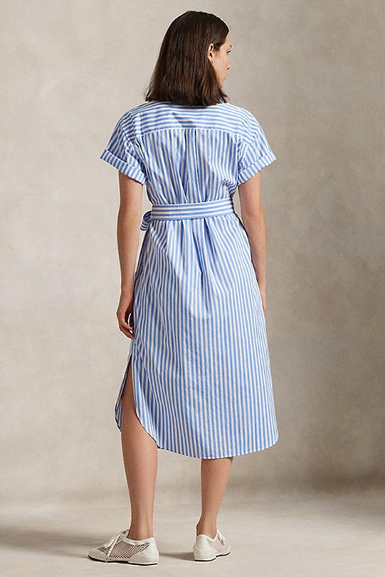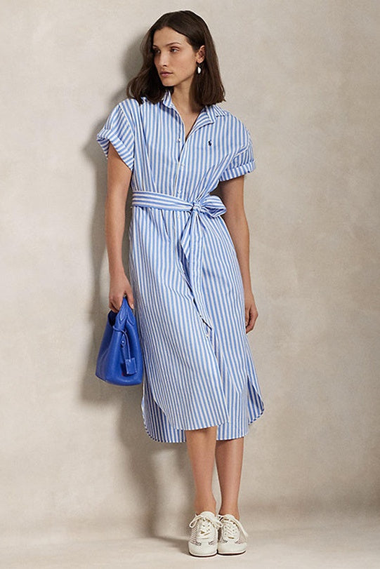 A timeless shirt dress that blends crisp tailoring with elegance. Crafted from breathable cotton with classic stripes, it features a button-down front and a coordinating belt to define the waist.