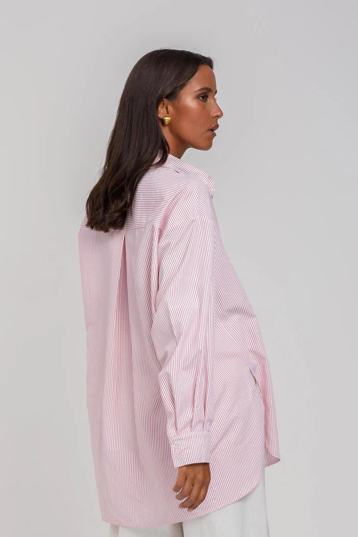 Indulge in this cotton white with red stripe shirt. The collared neckline and patch pocket add classic details, while the boxy fit and buttoned cuffs give it a modern touch. Perfect for any occasion, this shirt will elevate your wardrobe with its chic style. Don't miss out on this must-have addition to your closet!